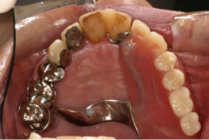歯がかなりぐらぐらしているため、入れ歯の針金が弱い歯にかかり早くに抜くようになるのを避けるため、ぐらぐらの歯の根だけ残して、入れ歯の中に入れる設計にしました。